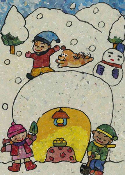 切り絵カレンダー 1月から12月までの各絵の下に日付と曜日が付けられ