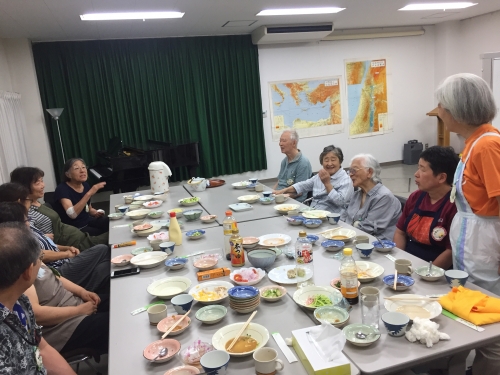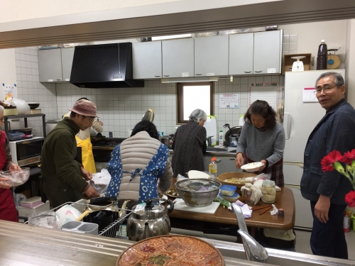・11時~ 買い物係りは近くの平和堂へ 男性Aさんは「僕は持つか かり」とニコニコ参加。会場係りで女性Bさんは花を活け、野菜などを手早く切る。男性Cさんはお殿様。Aさんも包丁さばきは上手で、毎朝奥さんの分も作っているという。